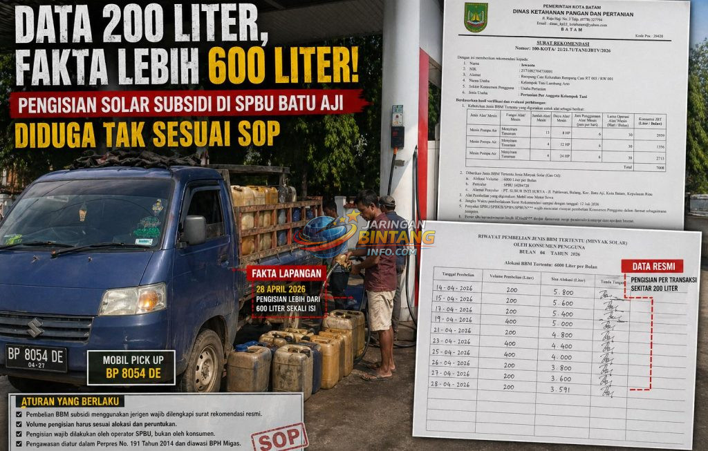 Batam – Praktik pengisian bahan bakar minyak (BBM) subsidi jenis solar menggunakan jerigen di SPBU Paradise Batu Aji (14.294.728) menjadi sorotan serius. Temuan di lapangan menunjukkan adanya dugaan ketidaksesuaian antara data administratif dengan realisasi pengisian, Rabu (28/4/2026).