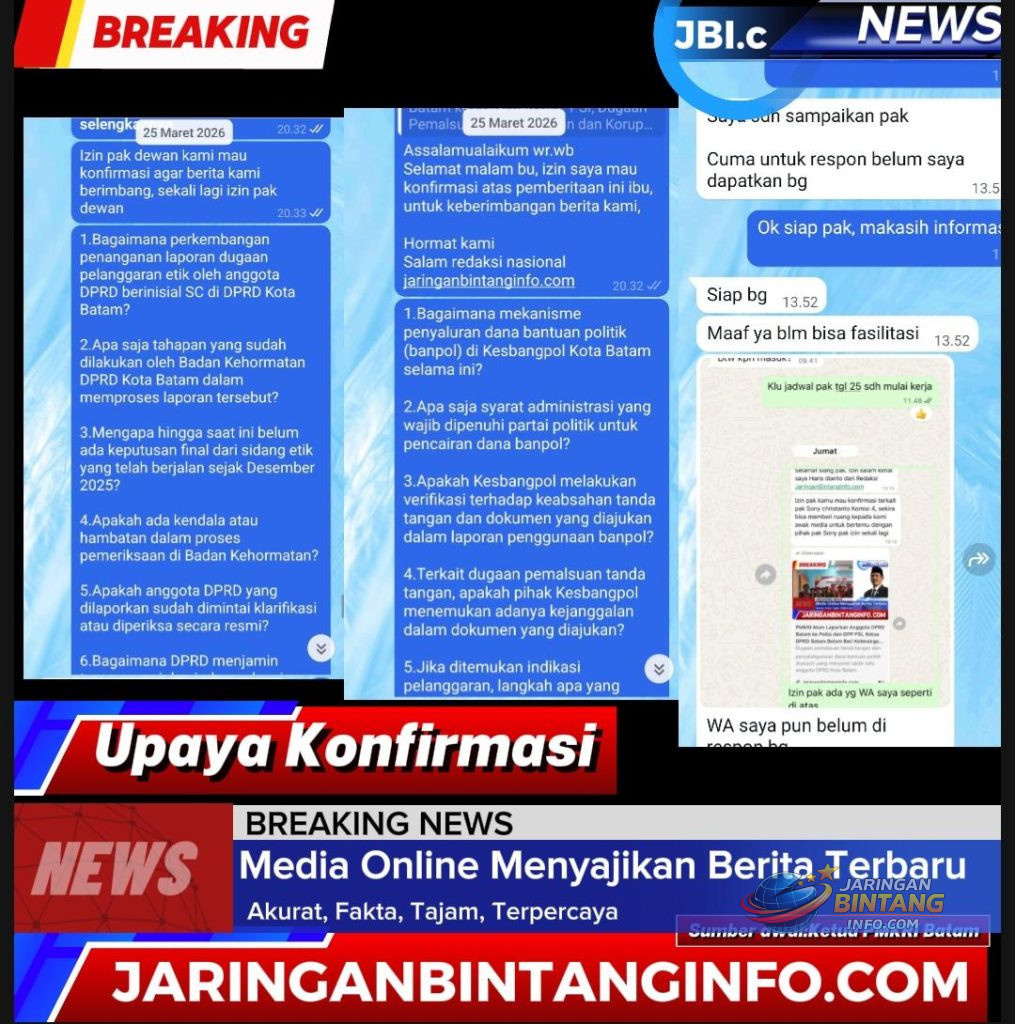 Redaksi JaringanBintangInfo.com telah berupaya melakukan konfirmasi kepada SC, Ketua DPRD Kota Batam, serta pihak Kesbangpol Kota Batam. Namun, seluruh upaya tersebut belum mendapatkan respons maupun keterangan resmi.
