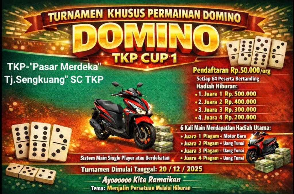 BATAM – Lembaga Swadaya Masyarakat Transparansi Kebijakan Pemerintah (LSM TKP) tingkat DPW, DPD, dan DPC Batu Ampar menggelar Lomba Turnamen Permainan Khusus Domino CUP 1 yang dilaksanakan di Pasar Merdeka, Tanjung Sengkuang, Kecamatan Batu Ampar, pada Minggu, 20 Desember 2025.